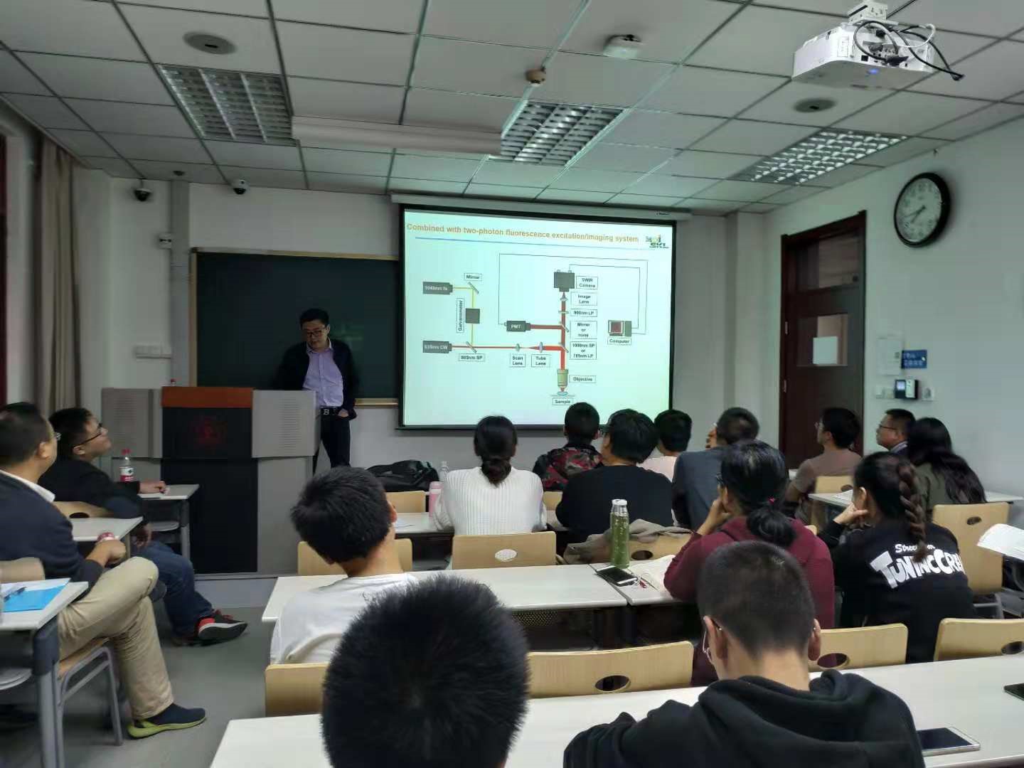 生命学院王斯佳博士致欢迎词并简要介绍了钱骏教授。钱骏教授在报告中生动有趣地展示了其近几年重点开展的“活体多光子荧光显微成像”和“活体近红外二区荧光成像”的工作,许多工作都达到了国际先进水平。钱骏教授长期从事“大深度光学生物活体成像”的研究,共发表了SCI论文70多篇,其中,第一/通讯作者论文49篇。应邀担任Optics Letters、Biomedical Optics Express、Advanced Optical Materials、Advanced Functional Materials、Biomaterials、Small、Nanoscale等高水平学术期刊审稿人。入选浙江省“新世纪151人才工程”。主持了国家自然科学基金面上、青年项目,973子课题(两项),863子课题,主持参与了国家自然科学基金重点项目。