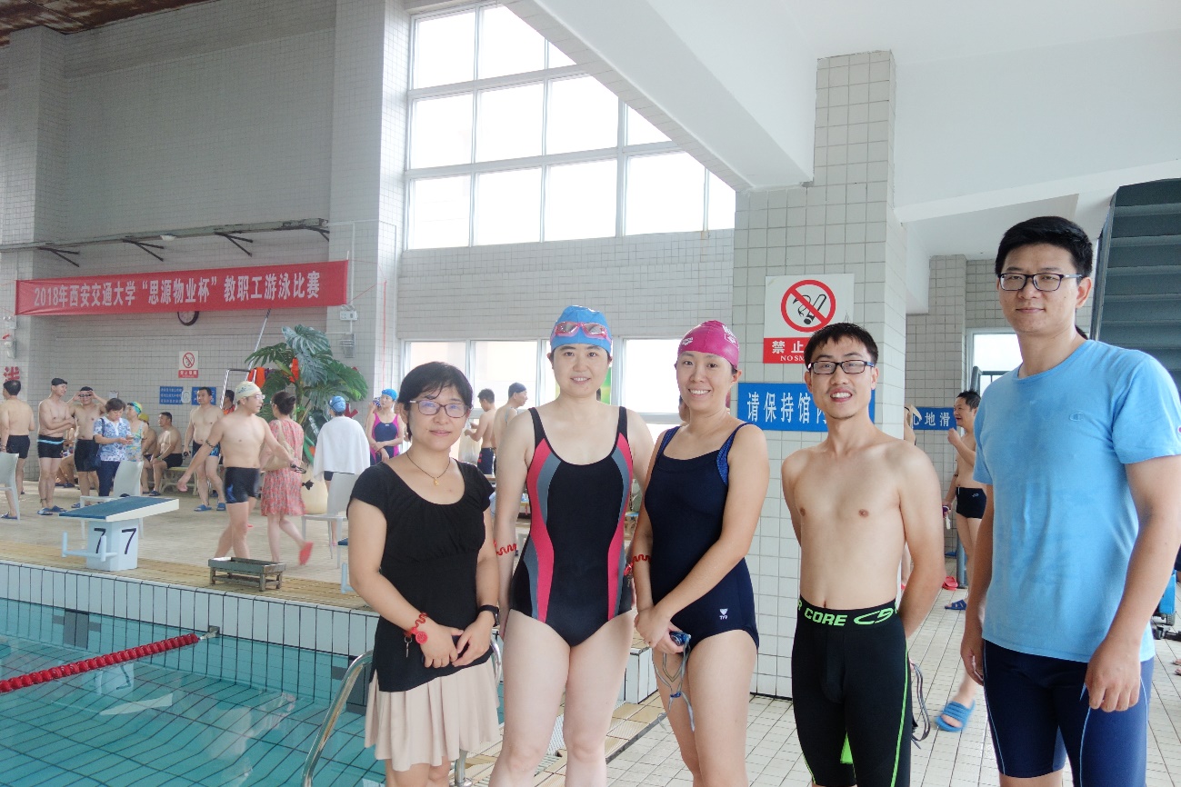 近日,在校工会主办的2018年西安交通大学“思源物业杯”教职工游泳比赛中,我院吴亮、邵晨、马玉菲、刘天四位老师代表生命学院参赛。学院工会主席宗瑜瑾领队,教练由工会体育委员刘天担任。