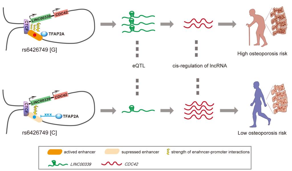 针对上述挑战,西安交大生命学院杨铁林教授课题组以骨质疏松症疾病为切入点,揭开了基因组“暗物质”非编码区1p36.12基因座的调控秘密:通过整合基因组、转录组、表观组和三维基因组的系统生物学分析,确立了1p36.12区潜在关键功能性调控变异——SNP-rs6426749。结合数据和功能实验,研究发现,该SNP位于一个增强子上,rs6426749-G碱基通过结合转录因子TFAP2A,激活增强子活性,进而通过染色质成环远距离调控位于600kb以外的长链非编码RNALINC00339的表达,LINC0339高表达显著下调CDC42表达,进而抑制成骨细胞增殖分化,增加骨质疏松症患病风险。该研究首次解析了1p36.12非编码区骨质疏松症易感变异的分子调控机制,发现一个全新的骨质疏松症潜在药物靶点,为研究复杂疾病非编码区风险变异调控机制提供了新思路,也表明西安交通大学在复杂疾病人类遗传学研究领域上了一个新台阶。