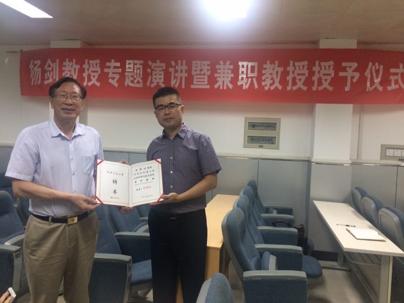 报告结束后,刘健康院长代表学校向杨剑教授颁发了由王树国校长签发的兼职教授聘书。
