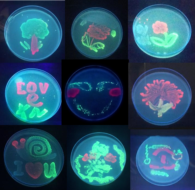 在快乐的学习中,充分发挥自己的创意,利用表达不同荧光蛋白的细菌绘出了绚丽多彩的画面,表达自己内心纯净多彩的世界,大家都来感受下微生物形成的美丽图案吧。
