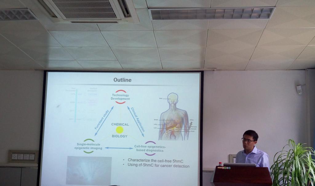 龙建纲教授主持了此次会议,他代表学院致欢迎词并简要介绍了宋春啸教授。宋春啸博士2008年本科毕业于北京大学。2013年获得美国芝加哥大学博士学位,导师为霍华德休斯研究员(HHMI)何川教授。此后加入斯坦福大学进行博士后研究至2016年5月,指导老师为美国医学院、工程院、科学院三院院士Stephen Quake。他将于2016年6月在牛津大学卢德维格癌症研究所开始独立研究。宋春啸博士长期从事表观遗传学研究,在Cell, Science, Nature Biotechnology, Nature Methods, Nature Neuroscience, Nature Structural & Molecular Biology, Nature Communications, Nature Protocols, Cancer Cell, Molecular Cell, JACS, PNAS等国际顶级期刊发表40余篇论文,引用超过4000次。