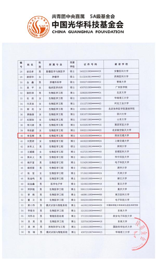 近日,中国光华科技基金会公布了2016年春季共青团中央中国光华科技基金会医学奖学金的获奖名单,来自全国各高校的58名博士、硕士生获得了这项荣誉。我院博1341班李昱辉获得此项荣誉,导师为徐峰教授。