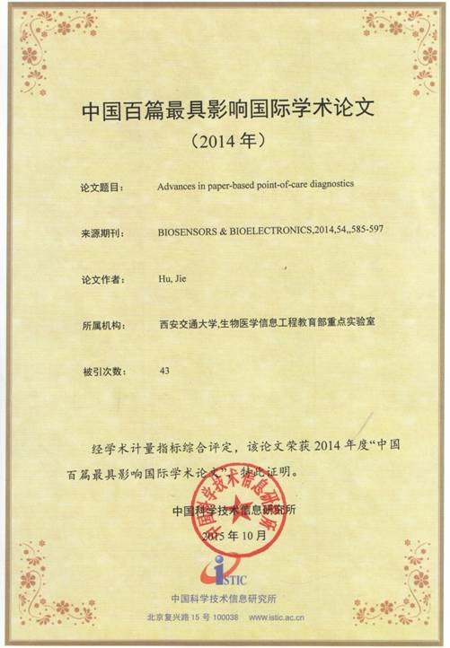 日前从2015年“中国科技论文统计结果”新闻发布会上获悉,仿生工程与生物力学中心(BEBC)卢天健和徐峰课题组于2014年发表在Biosensors and Bioelectronics期刊上的论文Advances in paper-based point-of-care diagnostics 入选“2014年中国百篇最具影响国际学术论文”。文章第一作者为生命学院生物医学信息工程教育部重点实验室博士生胡杰。