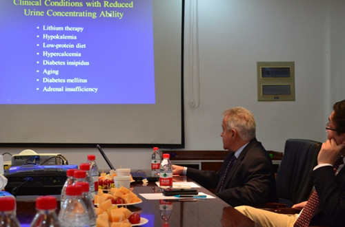 在接下来的这三场报告中, Jeff教授首先做了肾脏尿素运输调控及其对于多尿症(NDI)治疗的报告。因其主编经历,在第二个报告中Jeff教授详细讲述了SCI论文审稿流程及注意事项,为同学们后续发表文章提出了指导性的建议。蔡晖博士在报告中主要讲述了WNK1WNK4两种激酶对于钾离子通道的调节作用。田中民教授对其实验室开展的盐敏感高血压的肾脏代谢机制进行了详细的介绍,并和两位专家就课题设计,数据分析以及研究结果进行了深入的讨论。Jeff教授和蔡晖博士对我们的研究工作给予一些建设性的指导意见。在和Jeff教授的讨论中同学们受益颇多,从科学精神,科研设计到论文写作都受到了很大的启发。
