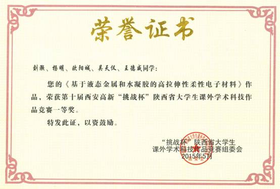 在刚刚结束的第十届西安高新“挑战杯”陕西省大学生课外学术科技作品竞赛终审决赛中,由我院徐峰教授指导,硕4053班刘灏同学负责的作品《基于液体金属和水凝胶的高拉伸性柔性电子材料》荣获一等奖,并帮助我校以团体总分第一的成绩捧得本届竞赛最高荣誉“挑战杯”。这也是该课题组继2014年9月在中国“华为杯”大学生新材料创新设计大赛中斩获一等奖之后,再度为学院争光。