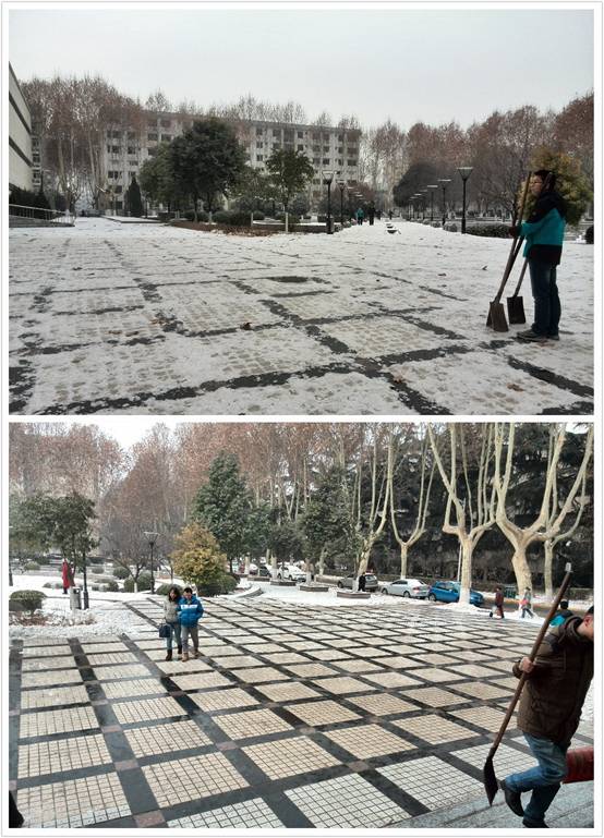 为了使同学们下雪天在康桥食堂就餐更加方便,2015129日,生命学院硕4053党支部的4名同学自发组织了积雪清理活动。在这4名同学的带领下,康桥的员工也加入到清理积雪的队伍,仅仅用了一上午的时间就将康桥西门广场的积雪清扫干净。