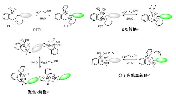 继Juyoung Yoon和Tony Czarnik于1992年发表的第一个硼酸荧光系统之后(J. Am. Chem. Soc. 1992, 114, 5874),Tony James和Seiji Shinkai于1994年和1995年共同撰写了一系列论文(J. Chem. Soc. Chem. Commun. 1994, 477; Angew. Chem. Int. Ed. Engl. 1994, 33, 2207; Nature, 1995, 374, 345),利用光诱导电子转移机理(PET),开发了邻苯氨甲基硼酸荧光探针,成功应用于生理条件下糖分子的检测。这项研究在糖的检测方法上引发了一场革命,被大量应用报道,引发国际社会广泛关注。2003年,乔治亚州立大学王炳和教授通过理论计算和实验验证,对上述识别机理提出质疑,随后提出pKa转换机理(J. Phys. Chem. B 2003, 107, 12942; Bioorg. Chem. 2004, 32, 571)。2017年Eric V. Anslyn教授又提出聚集-解聚机理(J. Am. Chem. Soc. 2017, 139, 5568)。但以上所有机理论断不能正确或完全解释荧光变化的真正原因。