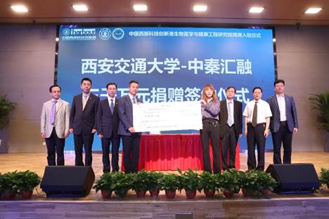 西安交通大学郑庆华副校长代表学校与中秦汇融生物医疗科技有限公司签订三千万元捐赠协议,并举行并举行首笔三百万元到款的捐赠仪式。