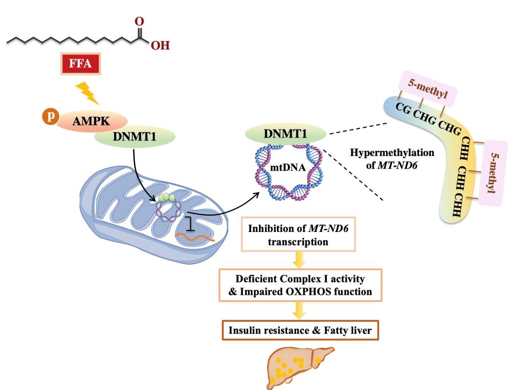 近日,我院刘健康教授、冯智辉教授团队、医学院臧伟进教授团队以及空军军医大学高峰教授团队等密切合作,从线粒体DNA甲基化调控线粒体稳态入手,在线粒体表观遗传学参与胰岛素抵抗机制方面取得重要进展。该研究发现,细胞内游离脂肪酸的升高能够通过激活腺苷酸活化蛋白激酶(AMPK)促进DNA甲基转移酶DNMT1的线粒体转位,进一步特异性地诱导线粒体DNA编码的呼吸链复合物关键基因MT-ND6的高甲基化,造成MT-ND6的转录抑制与线粒体氧化磷酸化受损,最终导致胰岛素抵抗的发生。该研究从线粒体表观遗传学的新角度揭示了线粒体稳态失衡参与胰岛素抵抗形成的分子机制,为2型糖尿病的防治提供了新的干预靶点和防治策略。论文评委认为“这一发现是线粒体基因调控和代谢疾病领域的一个里程碑”。