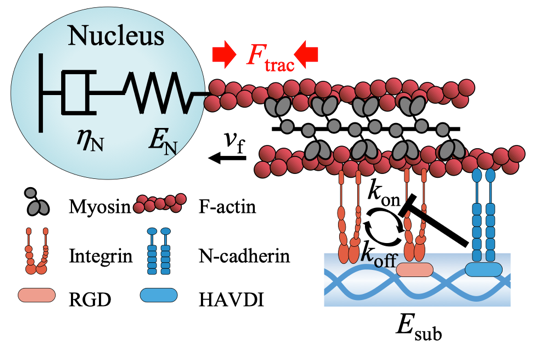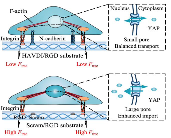 图2.基于细胞力敏感受体黏附拮抗效应的转录因子重定位模型