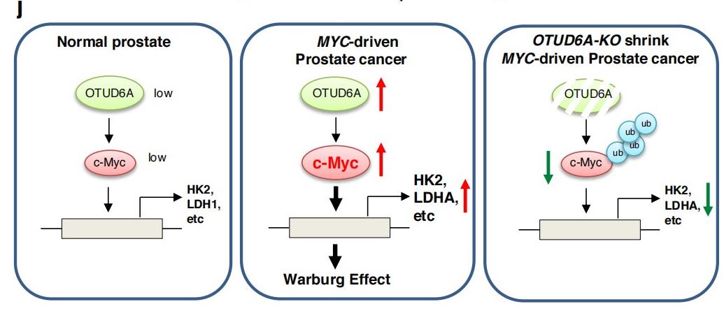 这项研究发现去泛素化酶家族成员OTUD6A是前列腺中特有的c-Myc去泛素化酶,其高表达是促进前列腺癌发生的重要原因。c-Myc是一种不稳定的蛋白质,通过E3连接酶介导快速泛素化和降解。在80-90%的原发性前列腺癌患者中检测到c-Myc的mRNA和蛋白的过度表达。与前列腺癌另两个经典分子PTEN和p53的缺失/失活相比, c-Myc的激活发生得更早,即在前列腺早期上皮内增生阶段。这项研究揭示OTUD6A可能是前列腺癌早期诊断和治疗中的关键靶分子(图1)。