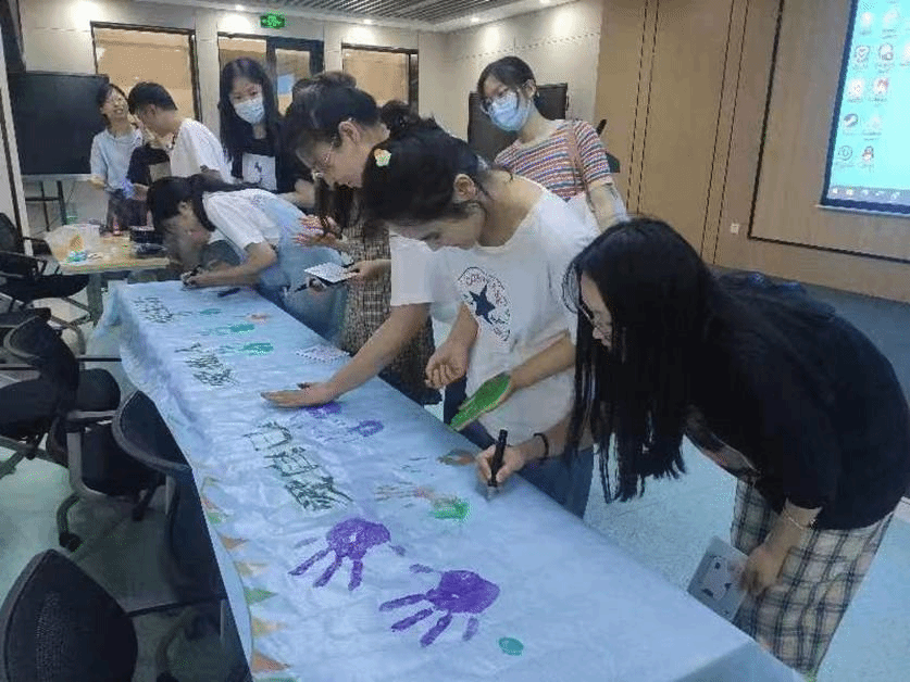 全院研究生积极参与到“让心灵沐浴阳光,聆听心底的声音”手指画涂鸦活动中,在横幅上通过印手印、涂鸦、留言等方式自由发挥,画出心中所想,写下温暖话语,尽情释放压力。