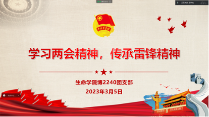 研究生党团支部开展雷锋月主题教育活动,将雷锋精神学习融入党团支部理论教育中,研讨雷锋精神在新时代的时代内涵和实践传承。博2240团支部开展以“学习两会精神,传承雷锋精神”主题团日,集体学习习近平总书记对深入开展学雷锋活动作出的重要指示,厚植雷锋精神、涵养进取品格。