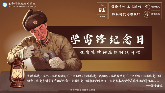 为加强氛围营造,学院专门制作学雷锋宣传海报,面向全院学生发布倡议书,号召生命学子将雷锋精神融入学习和生活。后续,学院将及时总结疫情中的经验,继续推进院级志愿服务队伍建设,夯实“劳育教育日”,挖掘选树优秀志愿服务典型,让雷锋精神在新时代绽放更加璀璨的光芒!