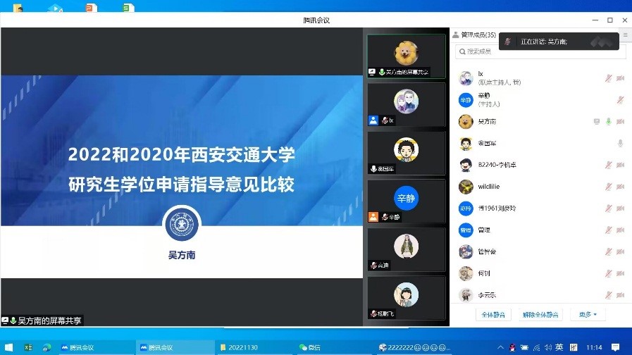 最后,吴方南博士给大家分享了《2022年西安交通大学研究生学位申请指导意见》。老师们就如何提高研究生的培养和学位论文的质量召开讨论。朱键教授和赵军武教授就学位论文最常见问题进行了剖析并给出了相关建议,并强调要端正学位论文的写作态度,提高学位论文的书写规范性。孙晓龙教授表示硕博士开题是保证论文进度、质量的重要前提,大家应意识到开题报告的重要性,提高开题报告的质量。